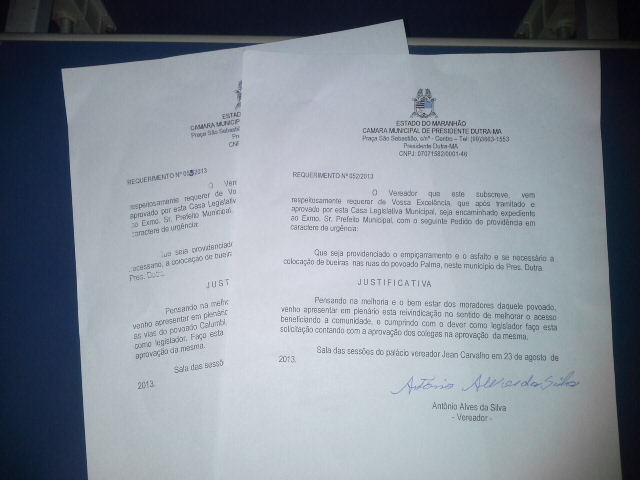 O vereador Antônio Galdino do PV apresentou dois requerimentos pedindo melhorias para os povoados Palma e Calumbi, principal base de apoio do vereador. Nos seus requerimentos Galdino pede ao poder executivo empiçarramento e asfaltamento das ruas dos dois povoados, inclusive com a colocação de bueiros.