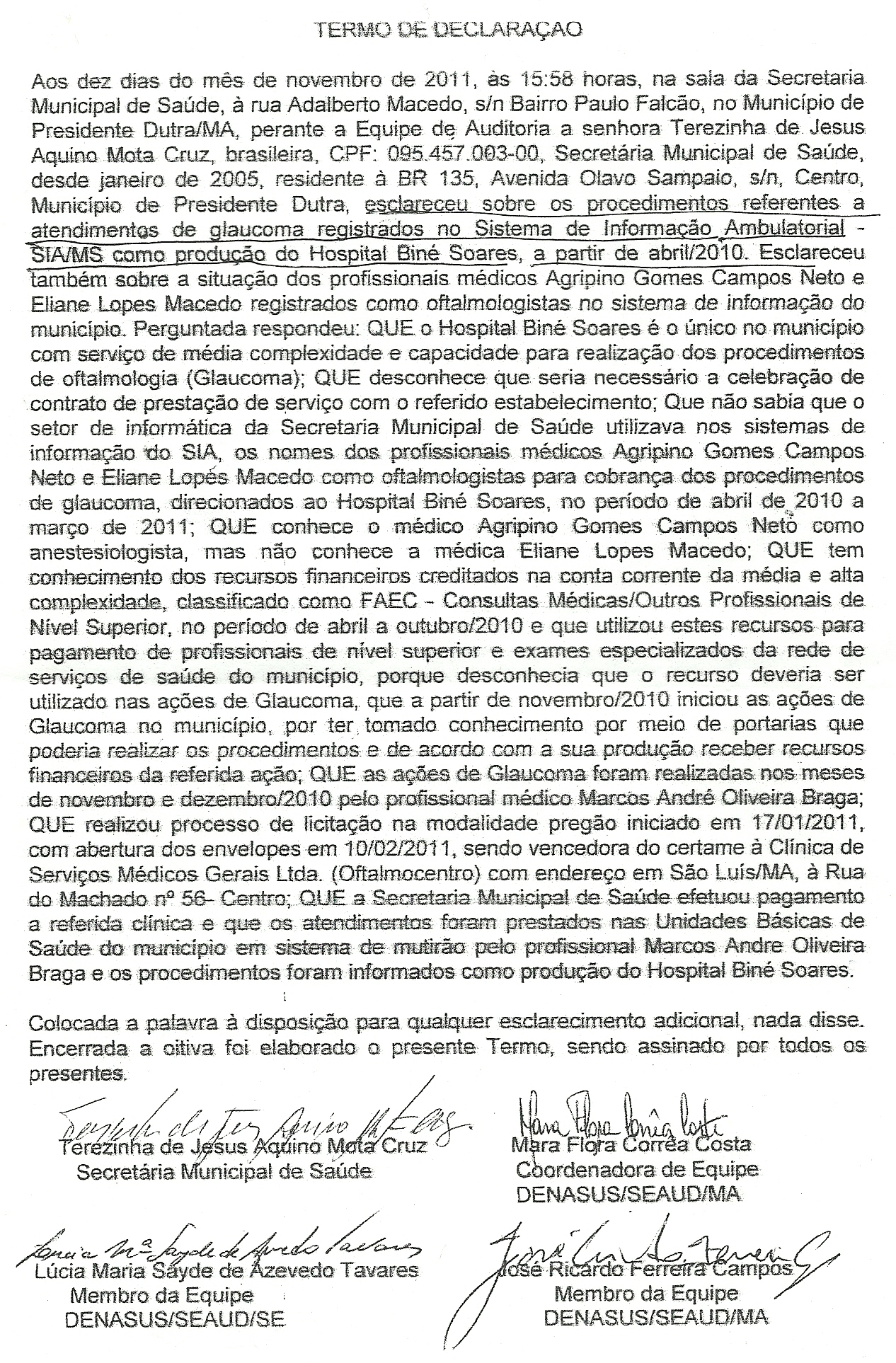 É no final do TERMO DE DECLARAÇÃO, onde não se consegue entender nada. A Secretária não diz coisa com coisa. Declarou QUE: 4 – As ações de glaucoma foram realizadas nos meses de novembro e dezembro de 2010 pelo profissional médico, Marcos André Oliveira Braga; QUE realizou processo de licitação na modalidade pregão iniciado em 17/01/2011 com abertura dos envelopes em 10/02/2011 sendo vencedora no certame a Clínica de Serviços Médicos Gerais Ltda. (Ofalmocentro) com endereço em São Luis/MA, à Rua do Machado nº 56 Centro; QUE a Secretaria Municipal de Saúde EFEUTOU PAGAMENTO à REFERIDA CLÍNICA e que os atendimentos foram prestados nas Unidades Básicas de Saúde do município em sistema de mutirão pelo profissional Marcos André Oliveira Braga E OS PROCEDIMENTOS FORAM INFORMADOS COMO PRODUÇÃO DO HOSPITAL BINÉ SOARES.