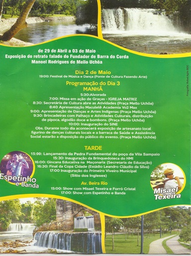 Cento e vinte e três dias depois de sua posse, o prefeito de Barra do Corda Eric Costa promove o aniversário do município em sua gestão sem ter o que inaugurar. A programação no convite impressiona pelo número de atrações, mas espremendo direitinho não sai praticamente nada. Sem ter o que inaugurar em termos de obras, a programação se resume a apresentações, brincadeiras e shows evangélico com Davi Sacer e sertanejo com Misael Teixeira da vizinha Tuntum. A novidade é o lançamento da pedra fundamental para perfuração de um poço artesiano na Vila Mariano.